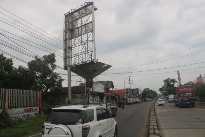 Papan reklame yang rusak di jalan nasional Desa Mancar, Kecamatan Peterongan membuat warga dan pengguna jalan waswas. Panel reklame ini ambruk dan menggantung usai tertiup angin kencang.