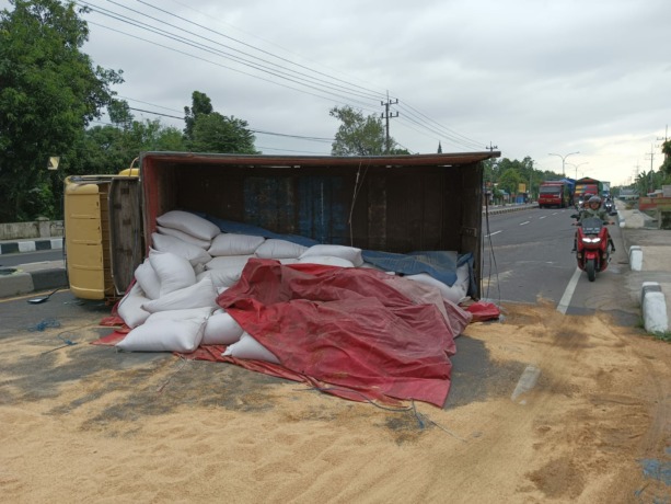 Kecelakaan tunggal menimpa sebuah truk bermuatan pakan ternak terjadi di jalur arteri nasional Desa Miagan, Kecamatan Mojoagung Jumat (24/2) pagi. Tak ada korban jiwa dalam kejadian itu, namun kecelakaan ini sempat membuat jalan nasional tertutup badan truk yang melintang.